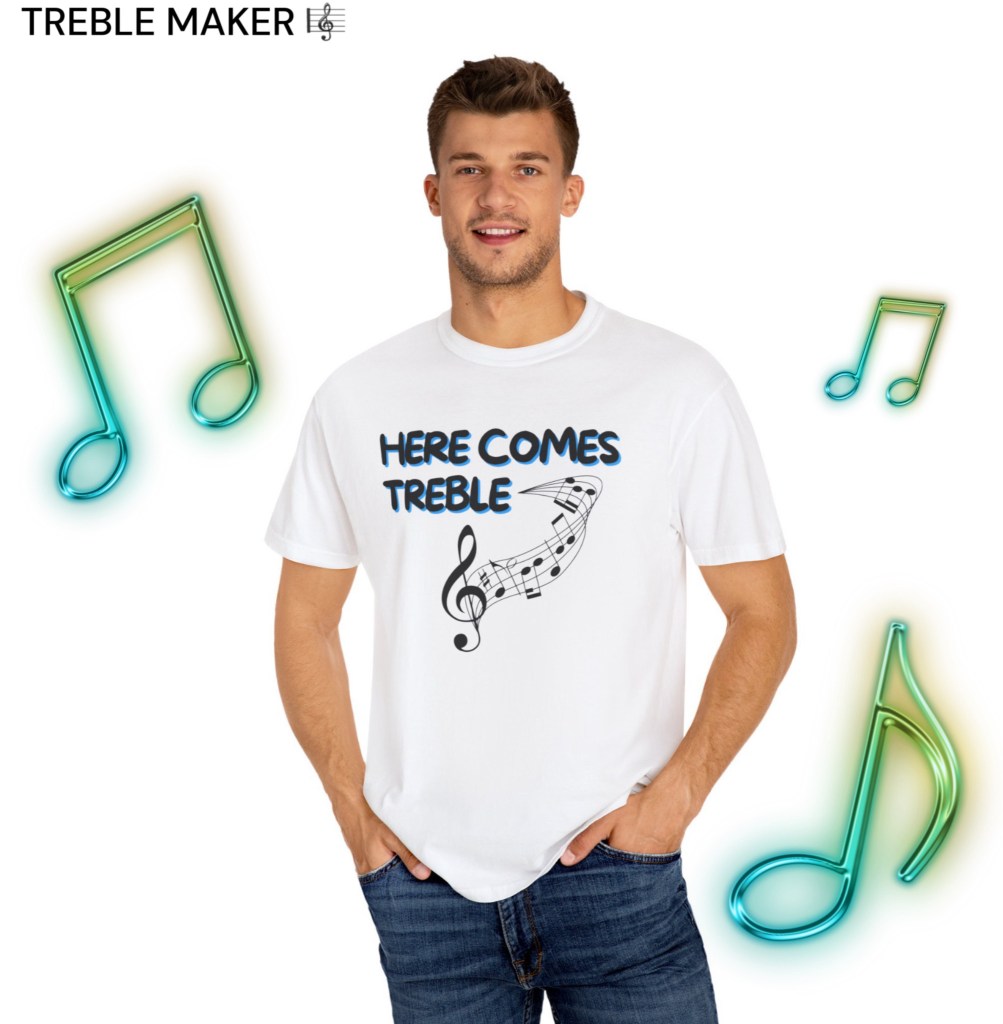 Front and center, the design features a prominent treble clef and the clever phrase “Here Comes Treble”—a pun that lands every time. On the back, a sleek circular graphic frames a solo treble clef, making sure you’re repping your love for music from every angle, whether you’re center stage or waiting on your next cold brew.